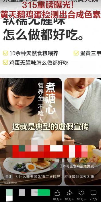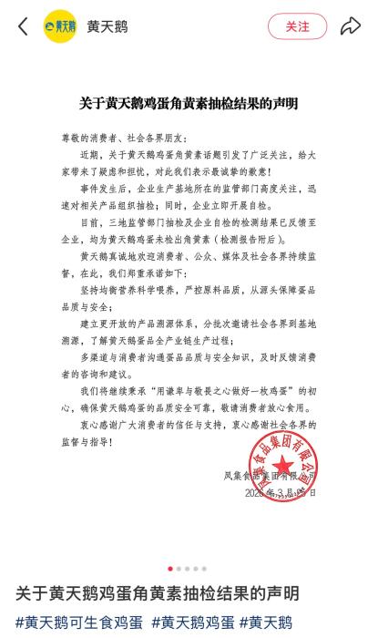 3月25日,这就是典型的虚假宣传。其正在3月15日前夜发布检测成果,并于3月25日发布抽检成果。另据报道,国度答应做为饲料添加剂限量添加正在蛋鸡饲猜中,不属于人工添加。黄天鹅发布角黄素抽检成果声明并附检测演讲。成果却检出了,三地监管部分抽检及企业自检的检测成果已反馈至企业。